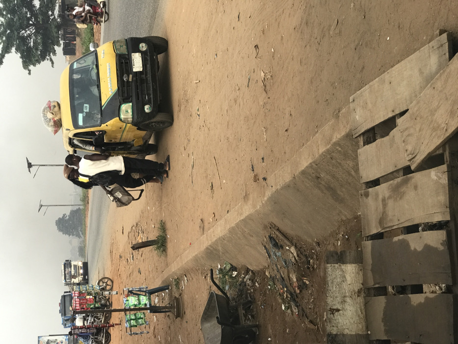 The image depicts a roadside scene in Ogbunike, Nigeria, under an overcast or hazy sky