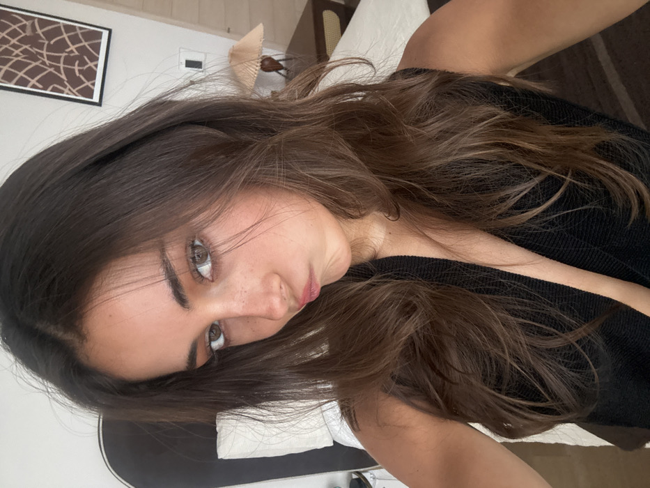 A woman with long, dark brown hair poses at an angle. She has fair skin, brown eyes, and freckles on her nose. She wears a black top. The background shows a room with a picture frame on the wall, a lamp with a wicker shade, and a bed. The lighting is soft and natural, highlighting her features.