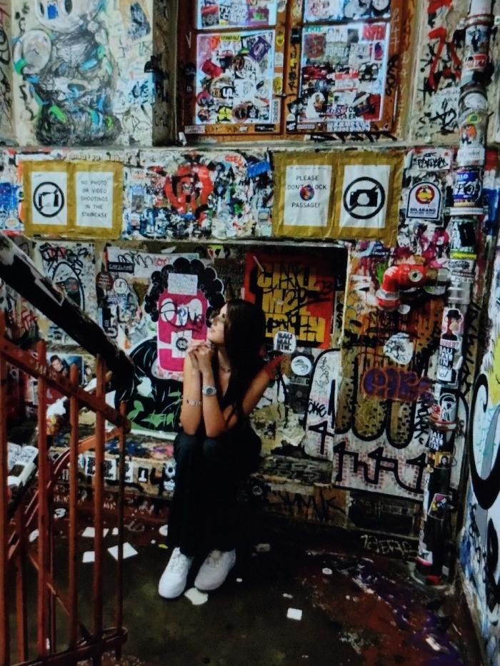 This image depicts a young female in a heavily adorned stairwell located in Otta, Norway