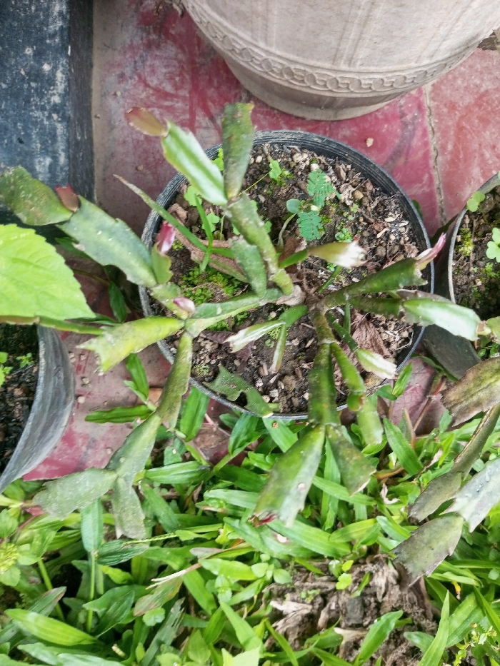 This image captures an overhead view of a *Schlumbergera* plant, commonly known as a Christmas or Thanksgiving cactus, situated in a garden or patio environment in Tecuci, Romania. The plant, housed in a black plastic pot, displays green, segmented stems with several small, closed pinkish-red flower buds. The dark soil within the pot contains sparse green vegetation, appearing as small weeds, and some dried organic material. This pot rests on a reddish-brown ground surface, which appears to be a tiled or painted concrete patio. To the immediate left and extending downwards, lush green ground cover consisting of various types of grass and weeds is visible. A partial view of another dark-colored pot with green foliage is present on the left edge. In the upper background, a substantial, light-colored ceramic or concrete planter with an elaborate, embossed decorative band is positioned on the same reddish-brown surface. A dark, vertical structural element, possibly a wall or larger container, is partially visible in the upper left portion of the frame.