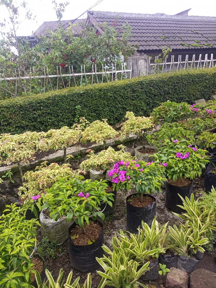 A tiered garden bed is filled with potted plants and various shrubs. Bougainvillea with vibrant purple flowers is mixed with plants featuring variegated foliage in shades of green and yellow. A tall, neatly trimmed hedge runs along the back. Above the hedge, a white fence and a glimpse of a tile roof of a house are visible. The sky appears overcast.
