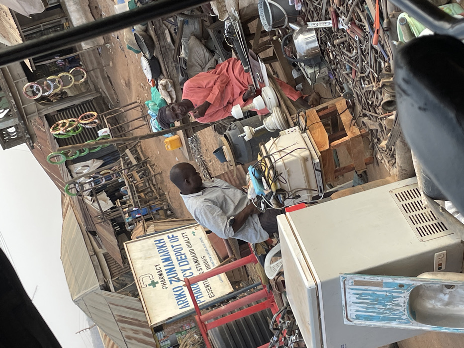 Two men are seen among various wares, including metal tools, fans, and appliances. One man lies down, dressed in a pink garment, while the other sits, wearing a light-colored shirt. A sign for "ARIKO ZUNAMARKH PHARMACY" is visible nearby, indicating a pharmacy depot. The scene appears to be an outdoor marketplace or a repair shop, filled with miscellaneous items and the tools of trade.