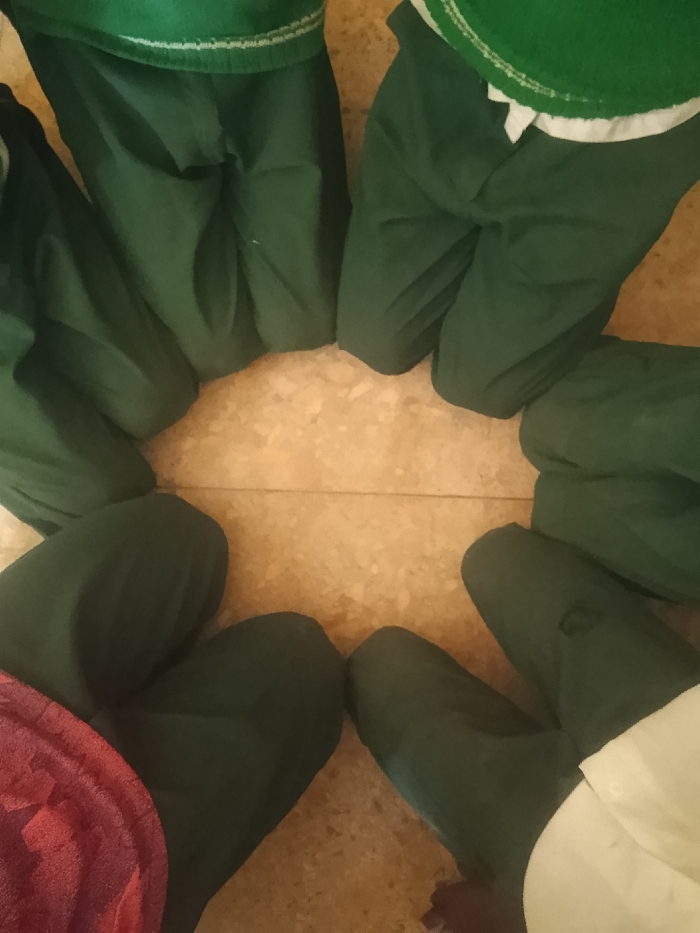 The image displays an overhead view of at least six individuals kneeling in a circular formation on a light-colored tiled floor. Each person is predominantly dressed in dark green attire, consistent with a uniform, appearing to be trousers or skirts with matching upper garments. One individual on the bottom left shows a glimpse of a reddish-maroon textile over the green. Another on the bottom right reveals a white shirt or collar beneath the green uniform top. A visible tear or scuff mark is present on the right knee area of the dark green trousers belonging to one individual in the lower right portion of the image. The individuals' knees are bent, and their lower bodies are arranged radially around a central point on the floor. A grout line or seam is visible on the light brown or beige floor tiles, extending through the center of the circle. The scene is indoors. No specific visual identifiers within the image confirm the location as Jos, Nigeria.