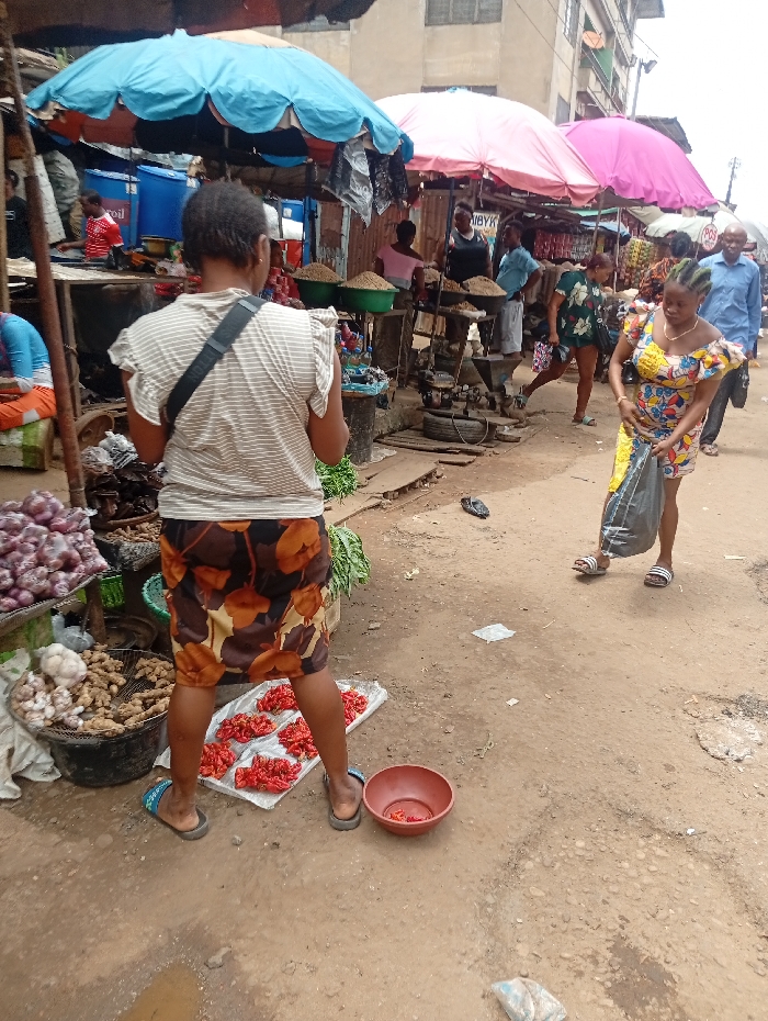 A bustling outdoor market features a woman selling red peppers displayed on a cloth, a basket of onions, and ginger. Shoppers browse under colorful umbrellas. A woman in a patterned dress carries a plastic bag, walking past the vendor. The ground is uneven and appears dirty. Buildings rise in the background.