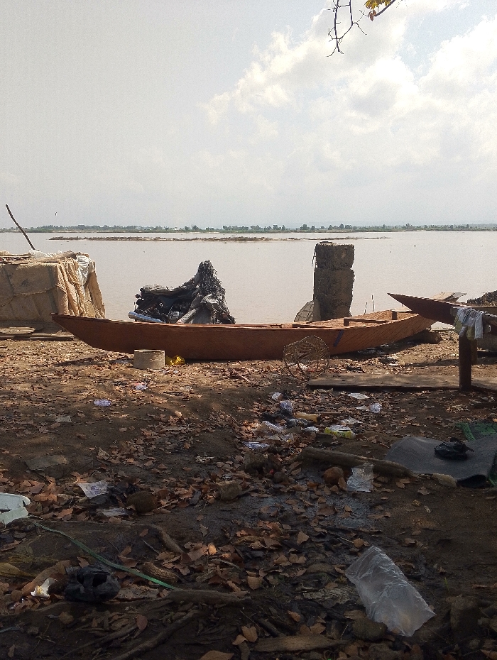 This image displays a cluttered waterfront scene in Lokoja, Nigeria