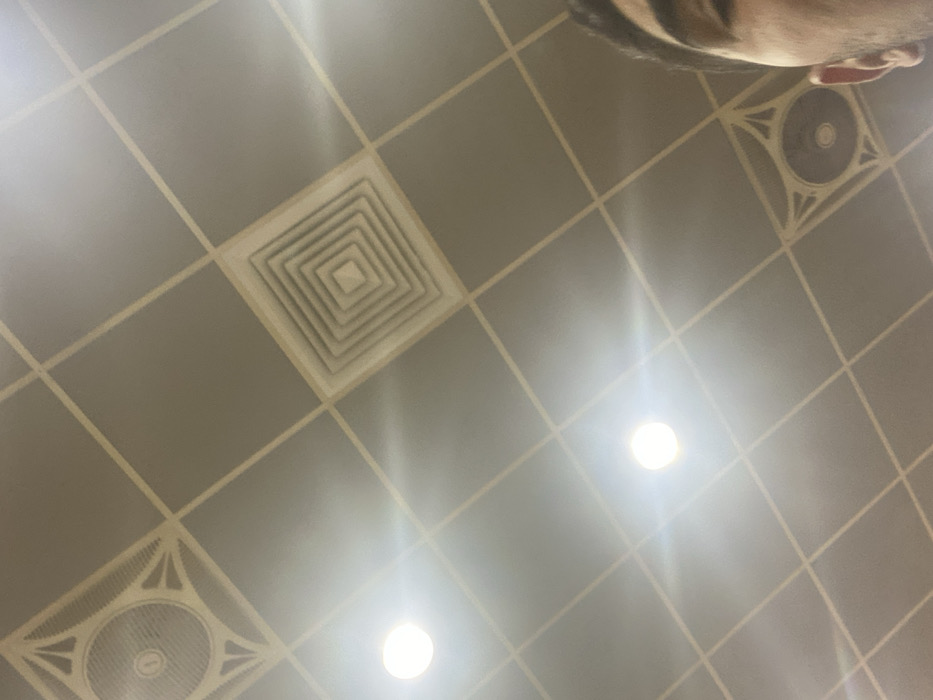 - "The image depicts an interior scene, specifically a detailed view of a light-colored ceiling with a portion of a person's head visible in the lower right" by FM-KX5IH3, licensed under CC BY 4.0