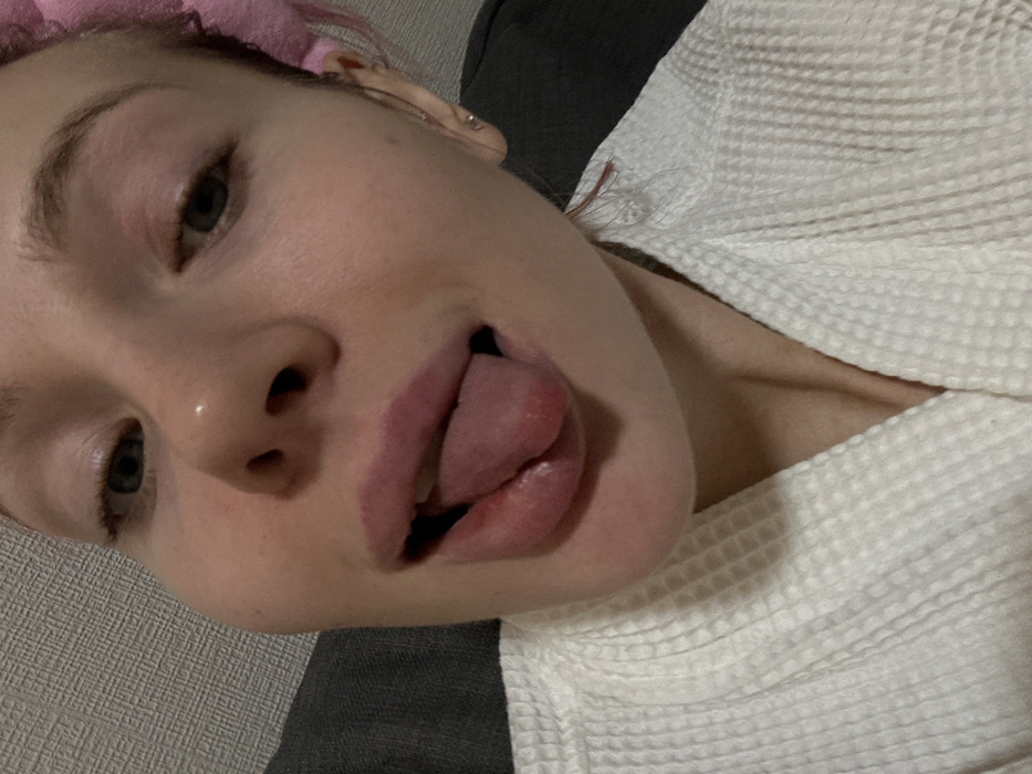 This image depicts a close-up, upward-angled selfie of a single individual, a woman, in what appears to be an indoor setting within the city of Vsevolozhsk, Russia. The woman's face fills the majority of the frame, from her forehead down to her mid-chest. She has light skin, blue eyes, and her mouth is open with her tongue extended downwards and slightly to the right. Her lips are full, and her tongue shows a distinct crease down the center. She is wearing a white, waffle-weave textured bathrobe. A pink or light red towel or fabric is wrapped around her head, visible at the top right of the frame. A small, circular earring is visible in her left earlobe. The background consists of a dark, textured fabric, likely upholstery, positioned to the left and behind her. No other individuals or significant objects are discernible. The lighting is even, suggesting an indoor ambient light source.