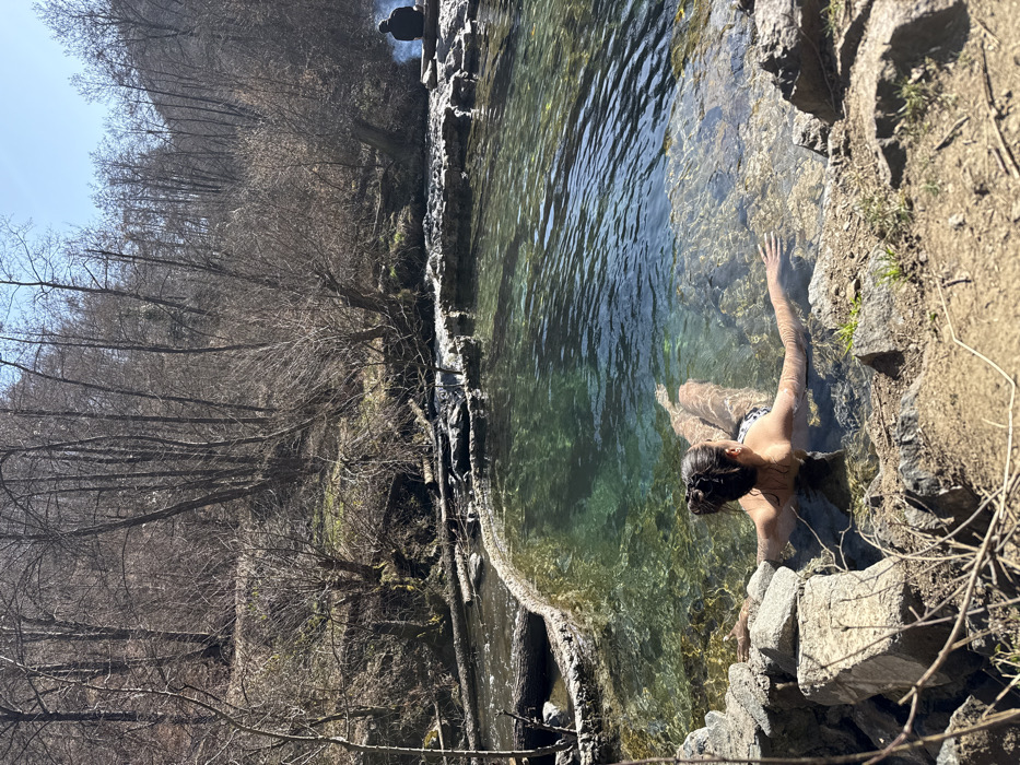 The scene displays an outdoor natural bathing area in Zheleznitsa, Bulgaria, under a clear blue sky. A female individual with dark hair, pulled back into a bun, is observed from a rear perspective, partially submerged in a clear, blue-green natural pool. She wears a patterned swimsuit and has her arms extended, resting on the rock-lined edge of the pool. To the left, a separate section of water, likely a river, flows past several fallen logs and natural rock formations. Further across the water, on a raised bank, a second, silhouetted individual is seated near a visible plume of white smoke, suggesting a small fire. The background features a dense forest composed primarily of leafless deciduous trees, indicating a late winter or early spring season. The immediate foreground consists of rocky, earthy terrain with minimal dry vegetation.