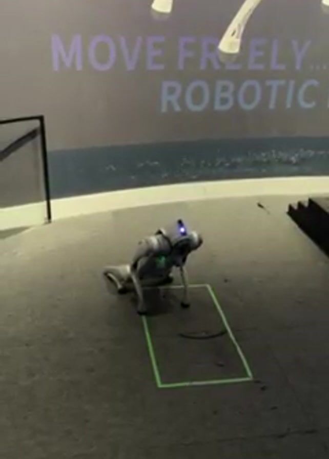 small, gray, four-legged robotic dog standing inside a green square. The robot has a blue light at the front. Behind the robot is a display wall with the words "MOVE FREELY... ROBOTIC" in large, purple letters. There are also large white depictions of legs on the wall above the text. To the left of the robot is a black rectangular structure, and to the right are the edges of some dark stairs. The floor is gray and textured. The robot remains stationary during the video.