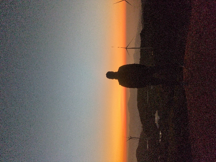 The image presents an elevated landscape scene at either sunrise or sunset, within a region consistent with Trường Thọ, Vietnam. The sky displays a gradient transitioning from light grey-blue overhead to vibrant orange and red hues at the horizon. A single individual stands centrally in the foreground, depicted as a full-body silhouette, facing away from the camera and towards the distant view. The person appears to be wearing outerwear. The midground and background feature multiple dark, undulating hills or mountain ranges. At least three silhouetted wind turbines are visible across the distant landscape: one on the far left, one on the far right, and one positioned to the left of the central figure. Two small, dark bodies of water are discernible in the midground on the left side. The immediate foreground is a dark, textured surface. The overall image exhibits noticeable digital grain.