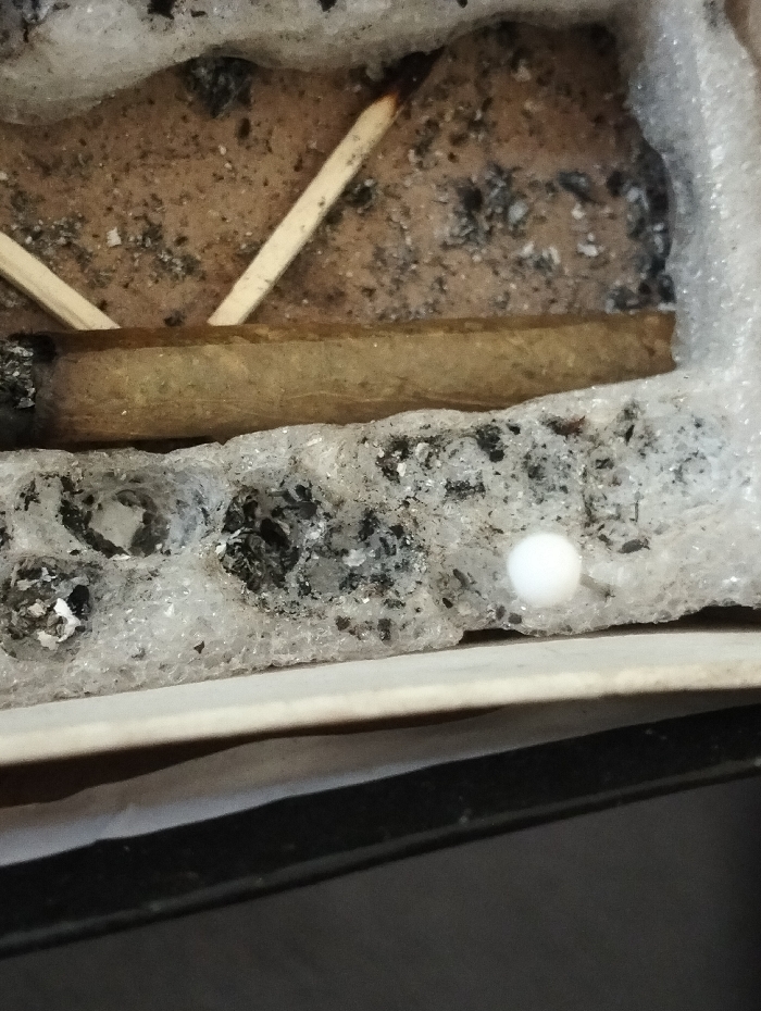 An ashtray holds a rolled cigarette, two used matches, and scattered ashes. The ashtray appears to be made of a light-colored, possibly granular material. A small, round, white object rests on the edge of the ashtray. The ashtray is placed on a surface with a dark edge.