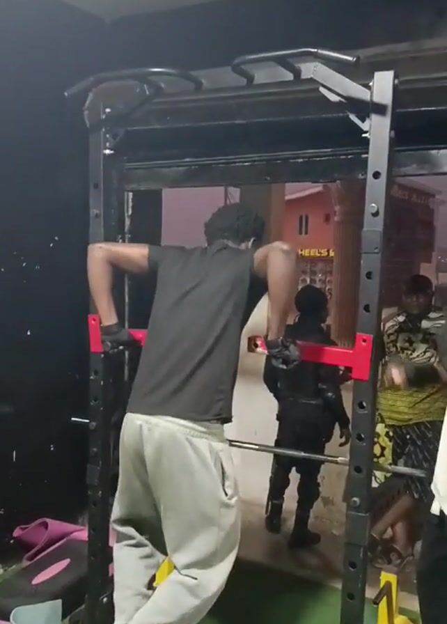 A man is shown doing dips on a dip station in a room with black walls and green turf flooring. The dip station is black with red bars. He is wearing a black t-shirt, gray sweatpants, and gray and white sneakers. There are other people standing around in the background, and objects like weights, foam rollers, and other exercise equipment are visible.
