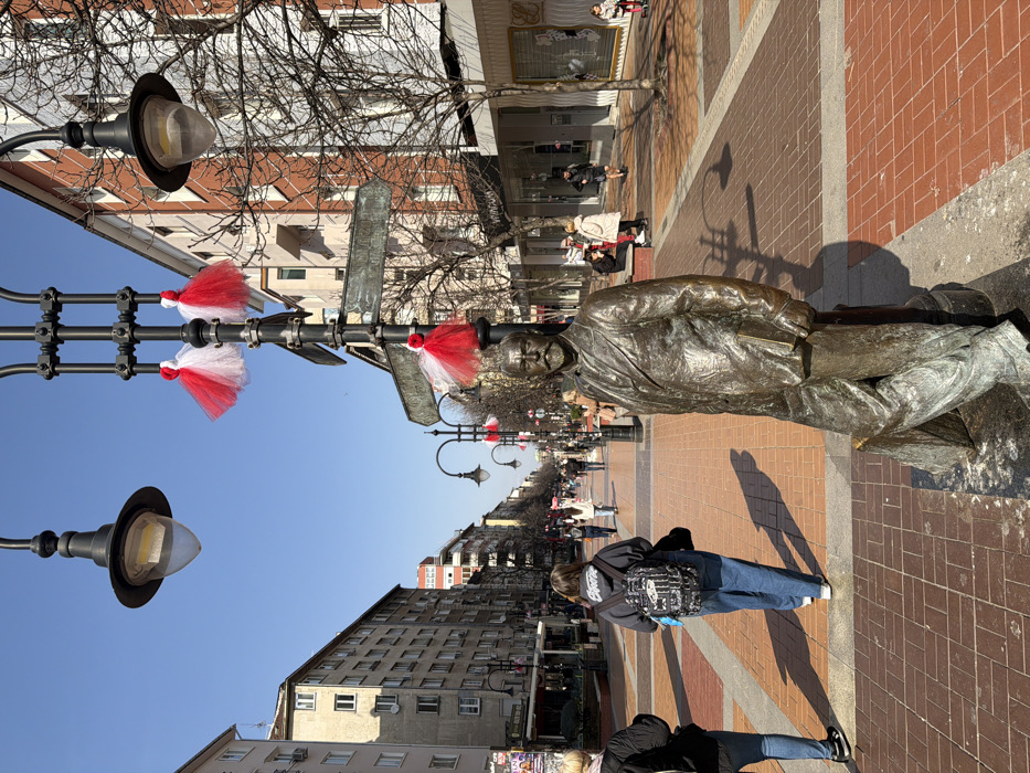 The image depicts a pedestrian street, identified as Vitosha Boulevard in Sofia, Bulgaria, under a clear blue sky on a sunny day. In the immediate foreground, slightly right of center, stands a bronze statue of a male figure, likely Aleko Konstantinov, depicted in a suit and holding a book, leaning against an upright support. The statue exhibits a dark patina. The ground is paved with rectangular bricks in alternating reddish-brown and lighter tan patterns, forming walkways. Strong shadows are cast from the statue and street furniture. Along the boulevard, multiple ornate black street lamps are visible, equipped with directional signs. Many of these lamp posts are decorated with red and white tasseled ornaments, commonly known as Martenitsa. The street is lined with bare deciduous trees, indicating a late winter or early spring season. Numerous pedestrians are observed walking in both directions along the wide thoroughfare. On the left side of the frame, a person wearing a dark hoodie and a black and white backpack walks away from the viewer, accompanied by another individual. Further down the street on the right, a group of people is seated on a low wall or bench. The boulevard is flanked by multi-story buildings. On the left, buildings appear primarily residential or mixed-use, with visible windows. On the right, buildings feature ground-floor commercial establishments with large display windows, and some facades exhibit reddish-orange brickwork. The street extends into the background, where more buildings and pedestrians are visible in the distance.