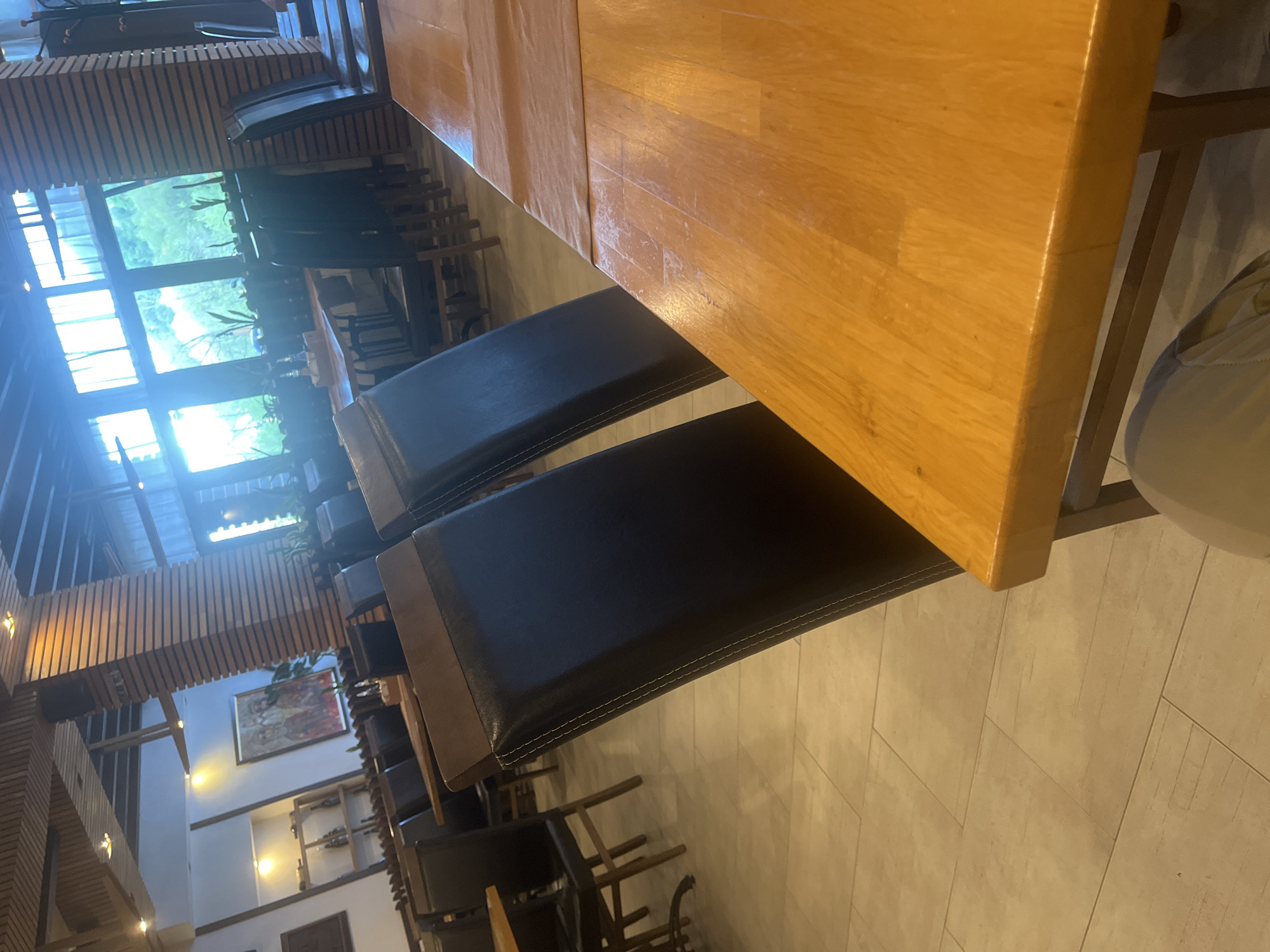The image depicts a restaurant interior, likely in Veliko Tarnovo, Bulgaria. A long wooden table dominates the foreground, with dark-seated chairs arranged along its side. The restaurant features large windows offering a view of greenery, possibly a park or landscape. The architecture of the building is modern with exposed beams and a high ceiling. A painting and decorative shelves are visible on a wall. The overall lighting suggests it is daytime. No people are prominently visible in the image.