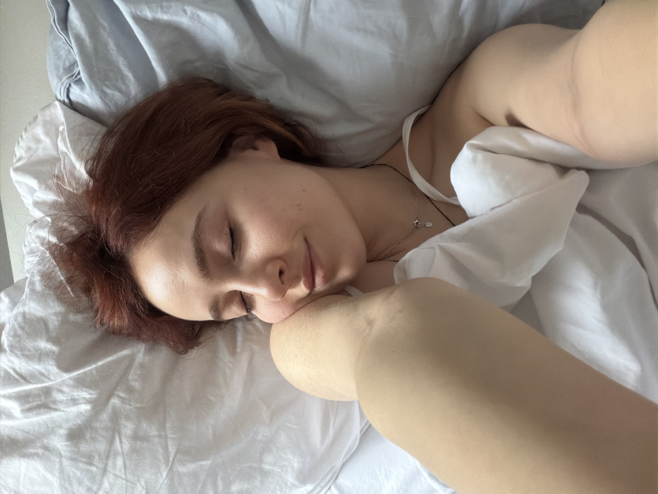 A young adult female is depicted in an indoor setting, lying in a bed with her head resting on white bedding. She is covered by a white duvet. The individual has short, reddish-brown hair and a fair complexion. Her eyes are closed, and her lips show a subtle, peaceful smile. She is wearing a white tank top and a thin silver necklace with a small pendant. Her right arm is bent, with her hand or forearm positioned against the side of her face. Portions of light blue/grey bedding are visible in the background. The precise location within the city of Reims, France, cannot be determined from the visual content of the image.