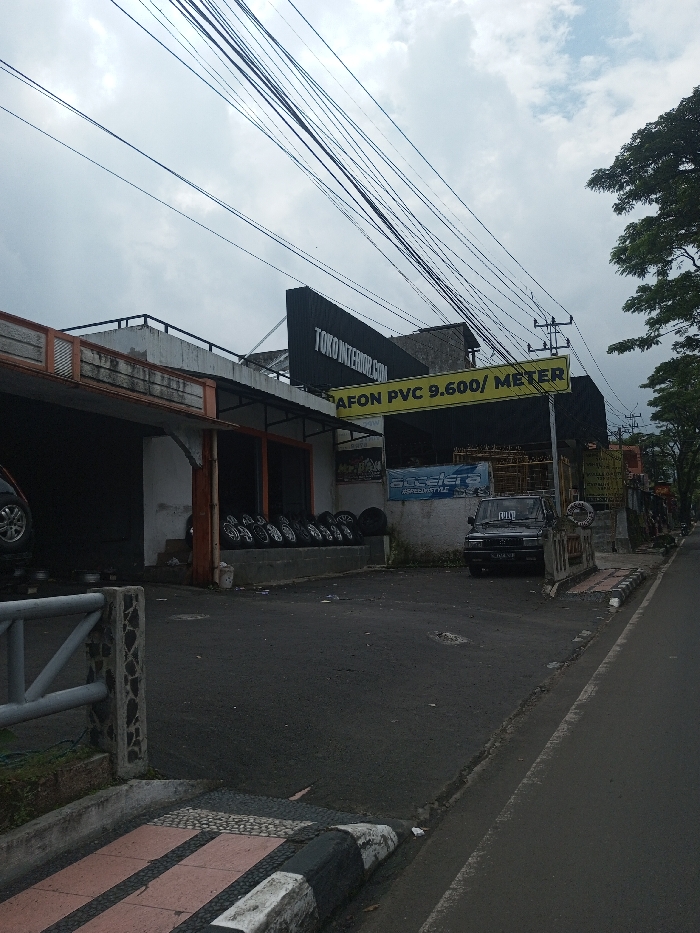 The image depicts a roadside scene featuring commercial buildings under an overcast sky. In the foreground, an asphalt road runs parallel to a sidewalk, separated by a black and white striped curb. A patterned concrete ramp leads from the sidewalk into a commercial property. On the left, a two-story building with a flat roof houses an open-bay workshop or tire shop, where a vehicle is visible on a lift with its wheels removed. Approximately 10-12 sets of car wheels are displayed on a raised platform in front of this bay. Multiple signs are affixed to the buildings. A prominent black sign with white text "TOKO INTERIOR.COM" is visible on the upper part of the main structure. Below it, a yellow banner with black text reads "AFON PVC 9.600/ METER". A blue banner, partially visible, displays "#speedstyle Accelera". A dark-colored, boxy SUV, possibly a Toyota Kijang, is parked in the forecourt facing the viewer, positioned beneath the yellow banner. Its license plate, "DK 1714 FA", is visible, indicating the vehicle is registered in Bali, Indonesia. A "FUJIO" sticker is present on its windshield. Numerous black utility wires traverse the upper frame, supported by poles visible towards the right. Green foliage from trees is present on the far right, bordering the road. No individuals are visible in the scene. The overall lighting suggests daytime with heavy cloud cover.