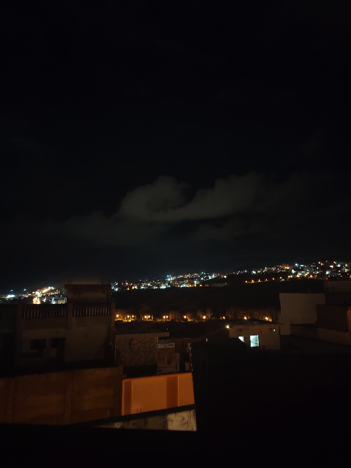 The image presents a nighttime panoramic view of the city of Tanger, طنجة, Morocco. The sky occupies the upper two-thirds of the frame, appearing dark with indistinct, dark gray cloud formations visible towards the horizon. No celestial bodies are discernable. In the foreground, the dark silhouettes of rooftops and parts of buildings are visible from an elevated perspective. On the left, a multi-story building with a light-colored facade features a prominent rooftop structure with a slatted railing. Towards the right, a lower building displays a brightly lit rectangular window. The immediate foreground is largely obscured by shadow. The midground features a dark, unlit expanse, possibly a park or undeveloped land, horizontally bisected by a line of approximately 15-20 warm, orange-yellow streetlights. Beyond this midground, the city of Tanger stretches across a distant hillside, illuminated by a multitude of artificial lights. These lights, predominantly white and yellow with occasional green and blue points, signify urban development, residential areas, and infrastructure. The density of lights suggests a spread-out urban landscape ascending a gradual incline. No people, specific vehicles, or discernible actions are visible within the frame.