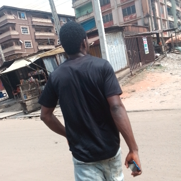 The image depicts an urban street scene in Awada, Nigeria. A male subject, viewed from behind, occupies the foreground, slightly off-center to the right. He has short, dark, curly hair and dark skin, wearing a black short-sleeved t-shirt and light-colored, possibly faded, jeans. His left hand is positioned towards his hip, while his right hand holds a dark-colored smartphone. The ground beneath him is an unpaved or dirt road of reddish-brown earth. In the background, on the left, a multi-story brown residential building with multiple balconies and white-framed windows is visible. Adjacent to the road, several small, rudimentary commercial structures made of corrugated metal are present. One on the immediate left appears to be an open stall displaying various goods. Further to the right, another multi-story building with green and faded reddish-brown sections is visible. A prominent utility pole stands in the mid-ground. Near the pole, another corrugated metal structure features a closed metal gate adorned with several posters or flyers. The sky is a bright, uniform light tone, suggesting an overcast or hazy day. No direct interactions between individuals are discernible.