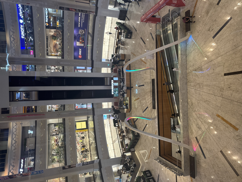 The image depicts an interior view of a multi-story shopping mall. Prominent brands like "STARBUCKS," "FUNCITY," "PRIME MEDIC," and "E max" are visible on various levels. Escalators connect floors, with individuals seen using them. Storefronts showcase a variety of retail offerings. Decorative archways with rainbow lighting add an artistic touch. Signs promoting sales in Arabic, translated as "Tashkiat sales", and "Tanzilat" indicating discounts, are noticeable. The layout suggests a modern and vibrant shopping environment.