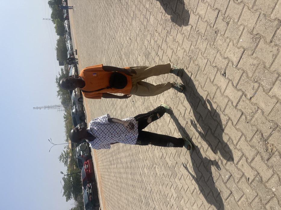 The image depicts an outdoor scene in Iddo Tudunwada, Nigeria, on a brightly lit day. Two young males are prominent in the foreground, walking from left to right across a surface of interlocking grey concrete pavers. The individual on the left wears a white short-sleeved collared shirt with a dark crosshatch pattern, black trousers with lighter patches on the legs, and light green athletic shoes. His right arm is slightly raised. The individual on the right wears an orange short-sleeved t-shirt with a small graphic on the chest, light brown baggy trousers, and dark green sandals; he carries a black circular cross-body bag slung over his left shoulder. Both individuals cast long, distinct shadows towards the viewer's left due to direct overhead sunlight. In the mid-ground, behind the two individuals, a parking area is visible with numerous parked vehicles of various makes and colors, including sedans and SUVs (red, silver, black, grey). Beyond the parking area, green foliage from trees and bushes is present. The background also features several tall streetlights, a prominent metallic telecommunications tower, and what appears to be a power line structure under a clear, light blue sky. Other indistinct figures are visible further in the background near the parked cars.