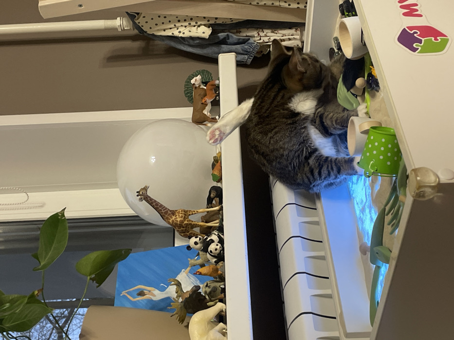 The image displays an interior residential scene in Moscow, Russia. A domestic short-haired tabby cat, featuring brown and grey stripes with white fur on its chest and paws, is positioned within a white, rectangular sensory table or sandpit. The cat's right hind leg is elevated, indicating it is actively grooming itself. The sandpit's interior is illuminated by a blue light emanating from beneath white sand, which contains various play items: a green bucket with white polka dots, two light-colored wooden cups, a green spade, a green rake, several small dark pebbles, and a small black and yellow insect-like toy. A multicolored puzzle-piece logo, partially displaying the word "MY", is affixed to the front side of the white table. Above the sensory table, a white windowsill is visible, with a white radiator directly beneath it. The windowsill is adorned with a collection of animal figurines, including a polar bear, a moose, a pig, a chicken, two pandas (one large, one small), a giraffe, a cow, and a fox. A large, spherical white lamp or decorative orb and a small blue painting depicting a ballet dancer in a white dress are also present on the sill, alongside a green leafy houseplant on the far left. To the right, a light brown wall transitions into a white vertical structure, possibly part of a closet or clothing rack, from which various garments, including a denim jacket and a polka-dotted fabric item, are hanging. A blurred view through a window on the upper left indicates an outdoor environment with natural light.