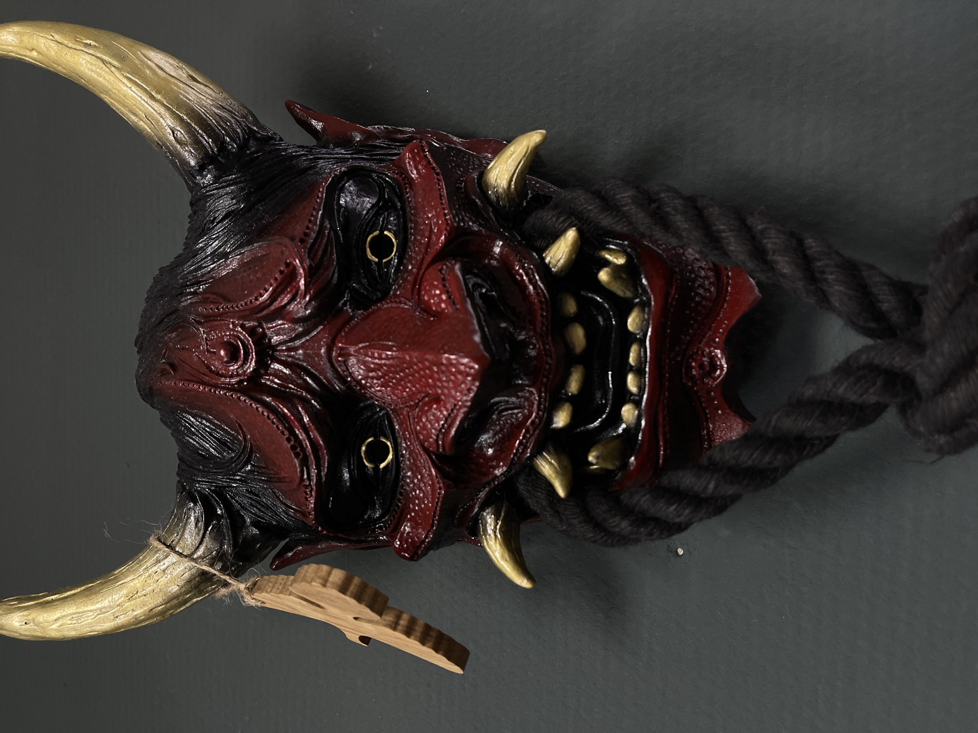 A detailed, head-on view of a sculptural mask is presented against a uniform, dark grey background. The mask, appearing to be a traditional Japanese Hannya or Oni style, features a predominantly deep red, textured surface with black accents delineating facial contours, hair-like elements, and the inner mouth. Two prominent golden horns curve upwards and outwards from the top of the mask. A small, light brown wooden tag, featuring a carved design, is suspended by natural twine from the base of the mask's proper left golden horn. The mask displays deeply set eye sockets with prominent golden rings in place of pupils, a raised brow, a distinct nose, and an open mouth revealing a row of small, black-tipped golden teeth and two elongated golden fangs protruding upwards from the lower jaw. A thick, braided black rope is attached to the underside of the mask's chin and extends downwards, partially out of the frame. The scene displays an inanimate object and no human subjects or explicit actions are visible. This object is located in Chaikovsky, Russia.