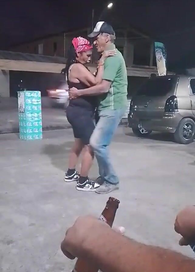man and woman dancing together in an outdoor space at night. The woman has a pink headscarf and is wearing a black dress and sneakers. The man has a baseball cap, a green shirt, and blue jeans. They are holding each other closely and moving to the music. A car is parked nearby and a beverage advertisement is also visible. In the foreground, a person holds a bottle of beer, partially obstructing the view of the dancing couple.