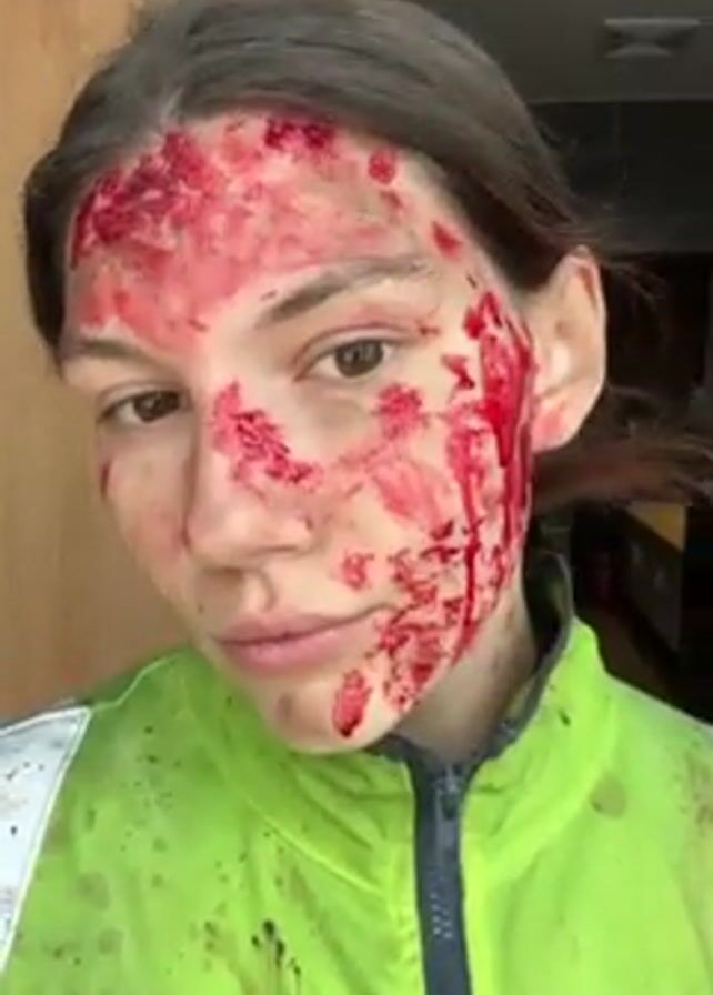 A person is wearing a bright green reflective jacket and has makeup on their face that resembles blood and cuts