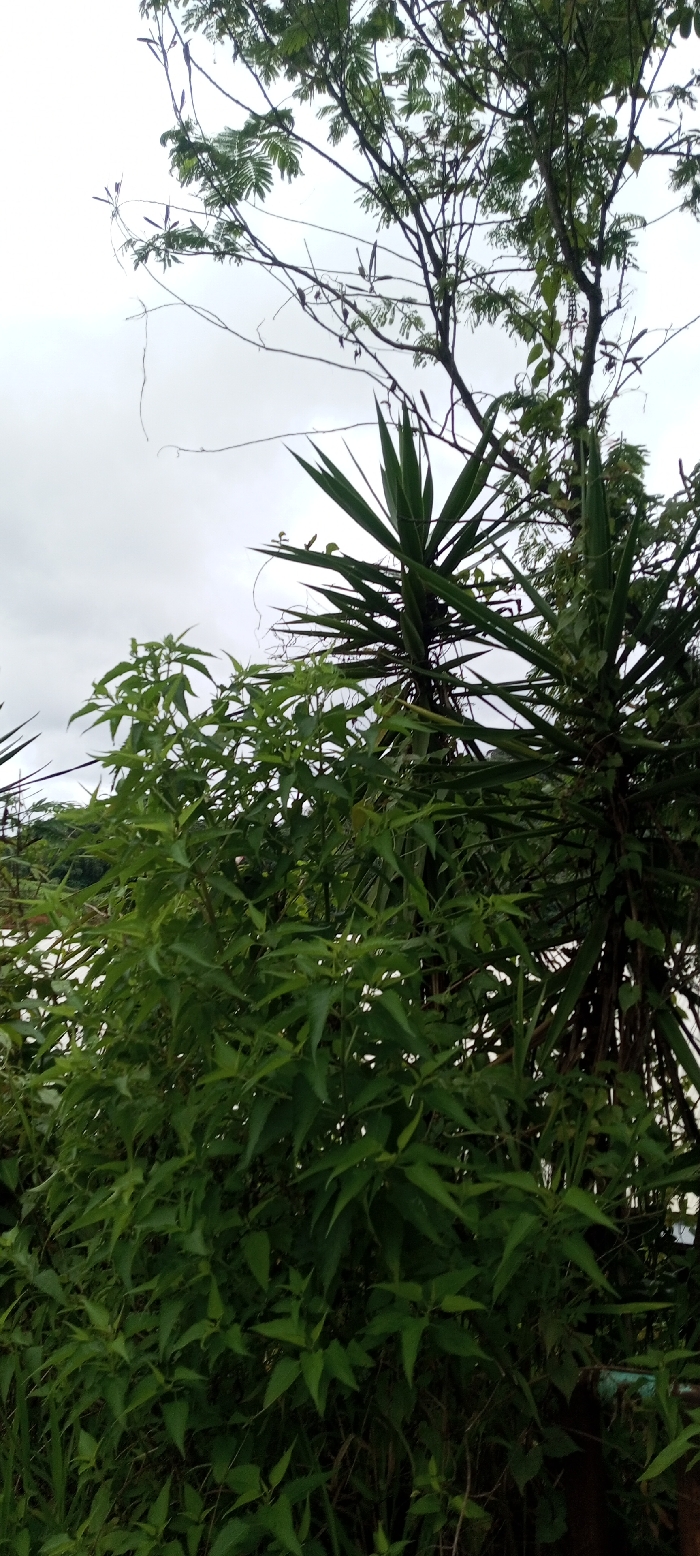 A close-up view showcases a dense arrangement of green foliage. A tree with slender branches and small, clustered leaves extends toward the cloudy sky. Below, a yucca plant displays sharp, pointed leaves, interspersed with other verdant vegetation. The lower portion of the image features a tangle of lush, leafy plants, obscuring much of the background. Overall, the scene evokes a sense of wild, overgrown greenery.