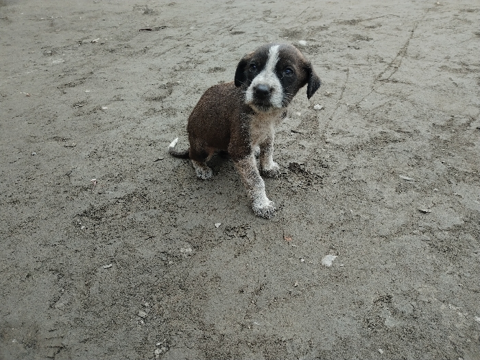 - "A small, muddy puppy with brown fur and a white stripe on its head sits in the center of the frame" by FM-CNZ8C3, licensed under CC BY 4.0
