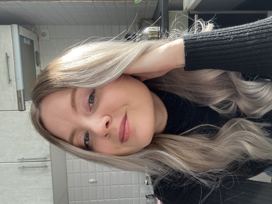 This image displays an adult female in an indoor residential setting, identified as a kitchen, in Chaikovsky, Russia. The subject, positioned centrally, has fair skin, long wavy hair with a blend of light blonde and darker roots, and green eyes with light pink eyeshadow. She is wearing a black ribbed turtleneck sweater and presents a faint smile. Her left hand is raised, with fingers partially visible, resting against the left side of her head, subtly pushing back hair near her ear. The background features light-colored wall cabinets with silver handles. Below these cabinets, white rectangular subway tiles cover the wall. A silver "ELICOR" branded range hood is mounted above the tiled wall in the upper right quadrant of the frame. To the right of the range hood on the tiled wall, a white electrical outlet is visible. A dark countertop runs along the lower right background, holding a reflective silver object, possibly a kettle, and a small potted plant. Blurred glass tumblers are visible on a surface in the lower left background. The scene is lit by a bright light source from the right, creating highlights on the subject's hair.
