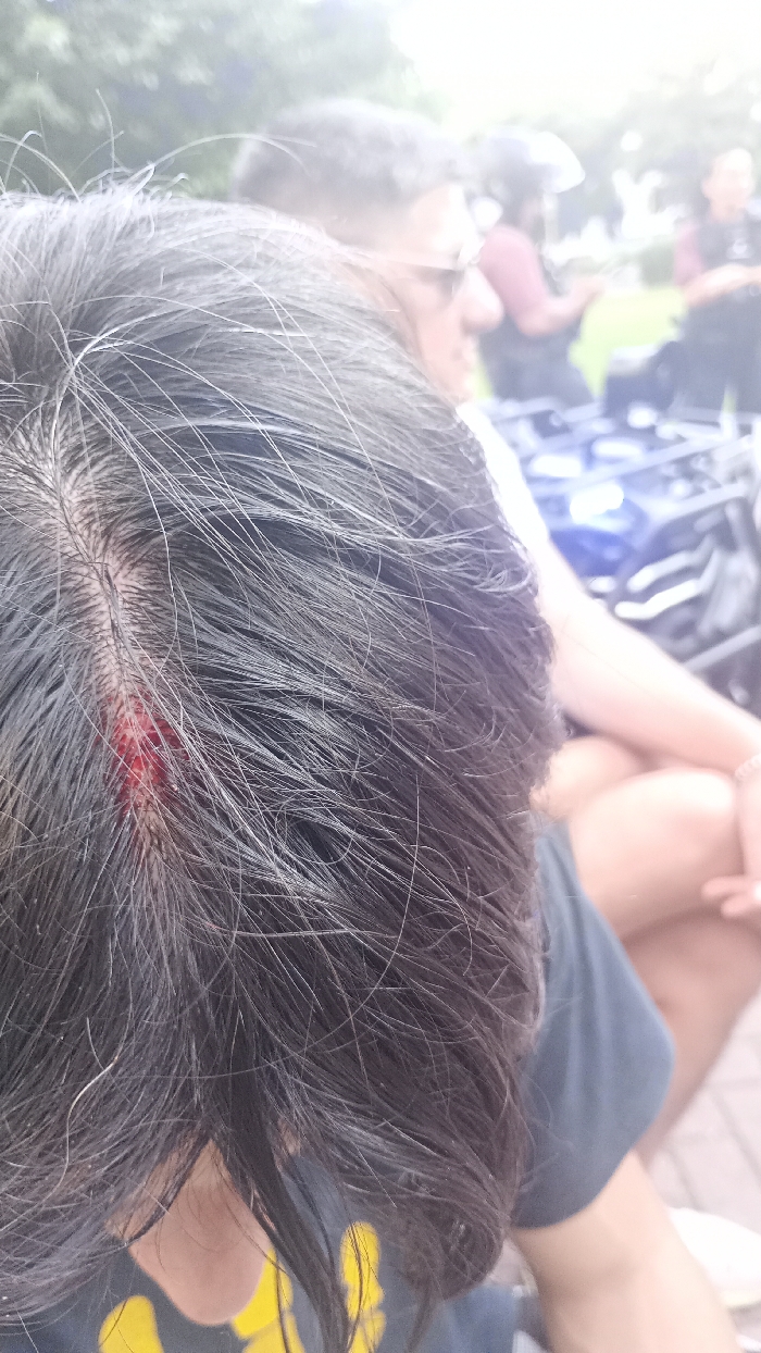 A close-up shot reveals dark hair with a visible red wound on the scalp, near the part. In the blurred background, two individuals are visible along with what appears to be a blue vehicle. One person in the background is wearing sunglasses. The foreground shows a person in a dark shirt with a yellow design. A brick surface is partially seen.
