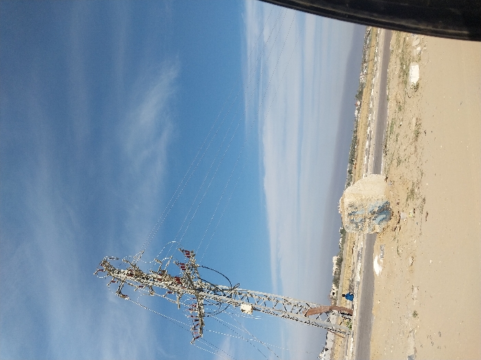 The image displays a daytime outdoor scene in al-Qarara, Palestinian Territory, under a clear blue sky with scattered cirrus clouds. A tall, lattice-style metal electrical transmission tower, appearing weathered with a reddish-brown base and silver upper structure, occupies the left side of the frame, leaning slightly to the viewer's left. It is fitted with numerous reddish-brown insulators and multiple power lines extending horizontally towards the right. A single individual, dressed in blue attire, is seated or crouching at the base of the tower, facing away from the camera. In the mid-ground, a paved road with distinct white concrete barrier sections on its shoulders runs horizontally across the scene. The immediate foreground is characterized by light brown, sandy, undeveloped terrain with sparse patches of green vegetation. A large, irregular concrete block, partially painted blue and white, is situated prominently in the right-center foreground, partially embedded in the sand. The background reveals a distant landscape with scattered buildings and structures, beneath a distinct, elongated dark haze or smoke plume stretching across the horizon from the center to the right.