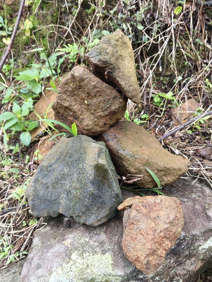 A small cairn of five rough, wet stones stands in a patch of vegetation