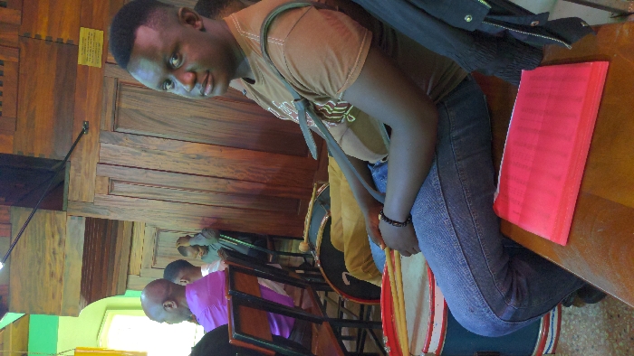 A dark-skinned man sits next to a wooden table with a red folder. He wears jeans, a brown t-shirt, and a black bracelet. A drum set is visible behind him. Other people are seated in the background; one wears a purple shirt. The room features wooden walls and paneling. A jacket hangs over the table.
