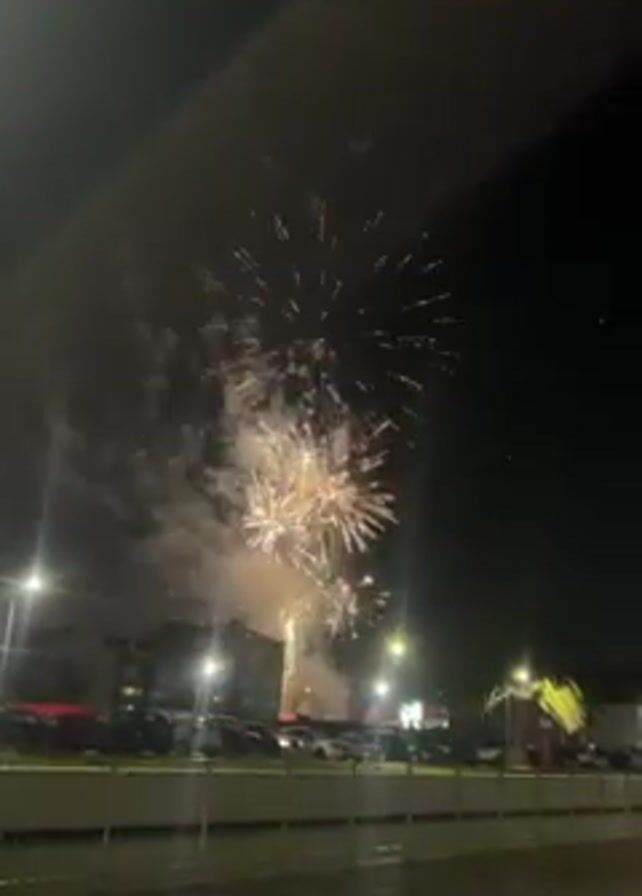 fireworks exploding in the night sky. The fireworks are various colors, including red, white, and gold. They explode in different patterns, including starbursts and cascading streams. In the foreground, there is a parking lot with cars parked. Behind the parking lot is a building and some trees. The video is shot from a car. The atmosphere is dark, but illuminated by the fireworks.