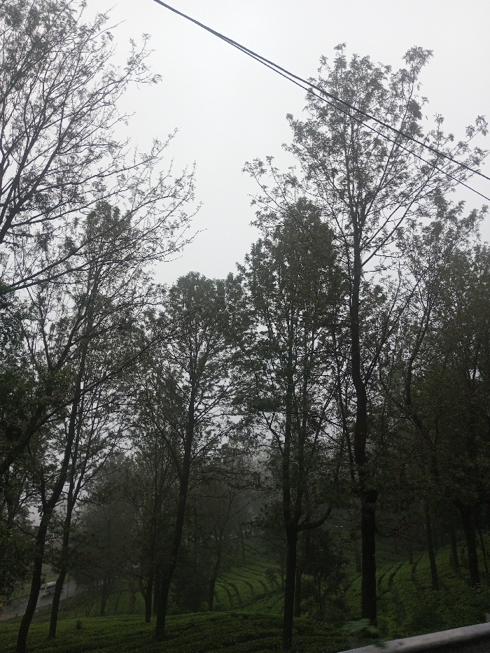 A landscape shrouded in mist features tall trees with dense foliage. The trees are the prominent feature, rising towards a gray sky crossed by electrical wires. Below, a field exhibits contoured patterns, possibly a tea plantation. The overall atmosphere is muted and subdued, creating a sense of tranquility and mystery. The weather appears foggy, reducing visibility.