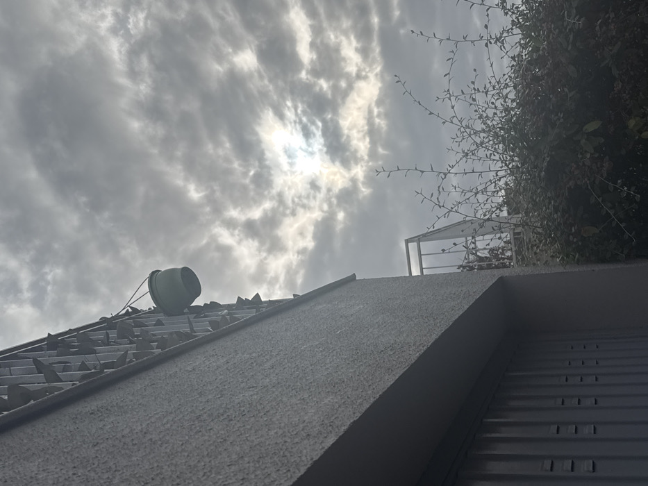 This image depicts an outdoor scene in the city of Caen, France, observed from a low angle looking upward under an overcast sky. In the foreground on the left, a light gray, textured stucco wall occupies a significant portion of the frame, with a segment of a vertically-slatted, light gray garage or industrial door visible below it. Above this wall, a dark metal railing, detailed with decorative, pointed finials, is visible. From this railing hangs a light green, empty plastic plant pot, suspended by three dark hangers. To the right and slightly lower, a second, plainer metal railing is partially visible, behind which a dense mass of dark green shrubbery with small leaves and numerous thin branches extends across the lower right portion of the frame. The sky is heavily clouded with gray stratocumulus formations, through which a bright, diffuse patch of sunlight is visible in the lower-middle to upper-right, indicating the sun's obscured position. No individuals are present in the scene.