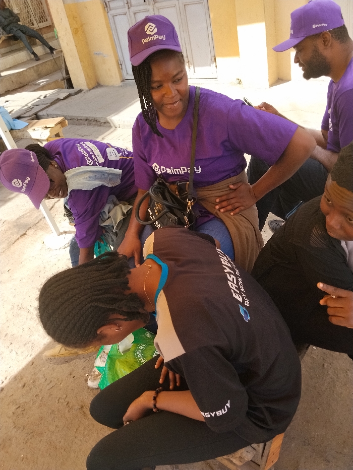The image displays an outdoor scene in Fagge A, Nigeria, featuring six individuals gathered during daytime. In the central foreground, a woman with braided hair wears a purple "PalmPay" branded cap and T-shirt, a brown skirt, and blue pants, with a black handbag on her lap. She looks to her left with a slight smile, her right hand positioned on her hip. To her immediate left, another woman, also in a purple "PalmPay" cap and T-shirt, leans forward, looking downwards, her face partially obscured but appearing to smile. To the central woman's right, a third woman, with braided hair, wears a black and light-colored "EASYBUY" branded T-shirt and black pants, seated on a wooden stool or crate, with her head bowed, looking towards the ground where a light green plastic bag is visible. In the background to the right, a bearded man, dressed in a purple "PalmPay" cap and T-shirt, is partially visible, engaged with a mobile phone in his hand. A sixth person's head and shoulder are partially visible in the immediate foreground right, wearing a dark top. In the far background on the left, a blurry figure in grey clothing is seen ascending a concrete staircase. The ground beneath the individuals is unpaved, consistent with dirt or loose soil. A light-colored building with a closed, possibly metallic, double door or gate is visible behind the group.