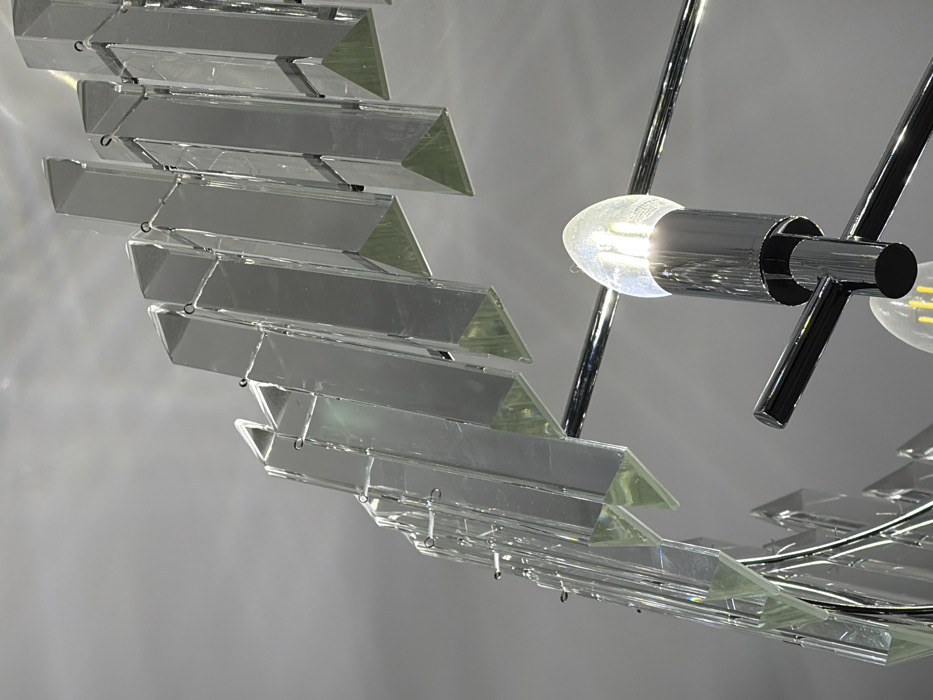 A modern chandelier, viewed from below, features a ring of reflective, triangular-edged glass pieces arranged in staggered rows