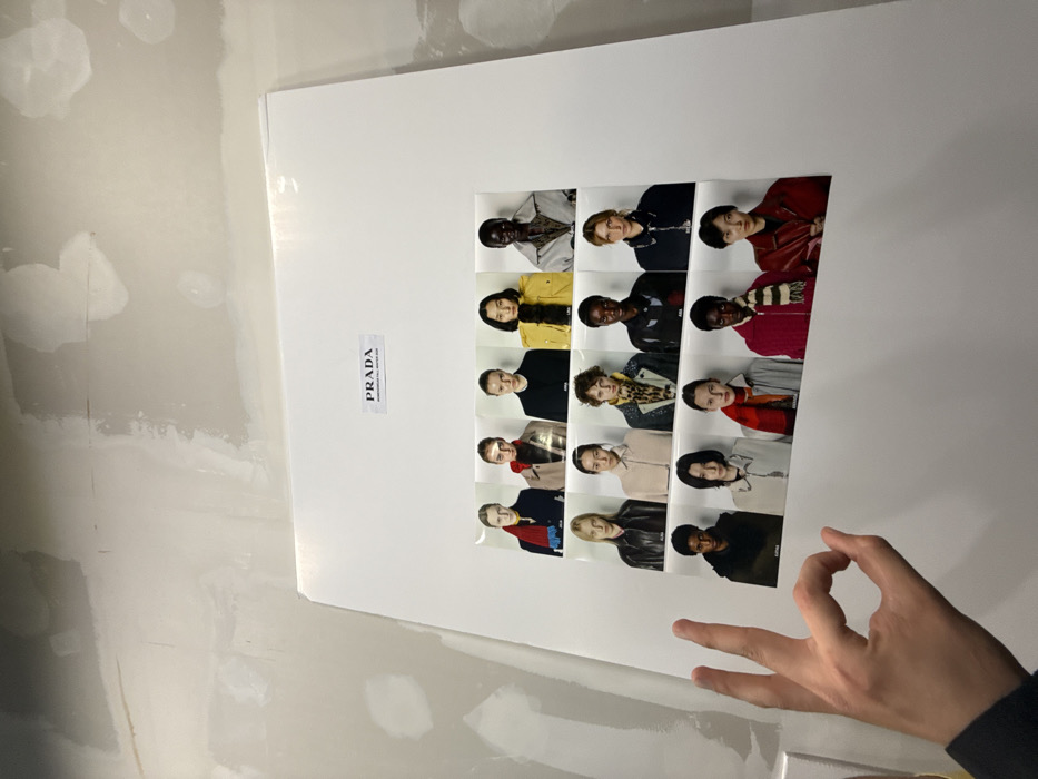A large white display board, oriented vertically, is positioned against an unfinished light-colored wall, indicative of a temporary setup or construction environment. The board prominently features the "PRADA MENSWEAR FALL WINTER 2024" logo at its top. Below the logo, fifteen individual portrait photographs of diverse models are arranged in a grid of three rows and five columns. Each model is presented in a distinct fashion look, featuring various garments and accessories such as coats and scarves. In the lower-left foreground, a light-skinned human hand is performing an "OK" gesture, with the thumb and forefinger touching to form a circle. The scene suggests a casting, fitting, or backstage area associated with the Prada Fall/Winter 2024 menswear collection, implicitly located in Milan, Italy.
