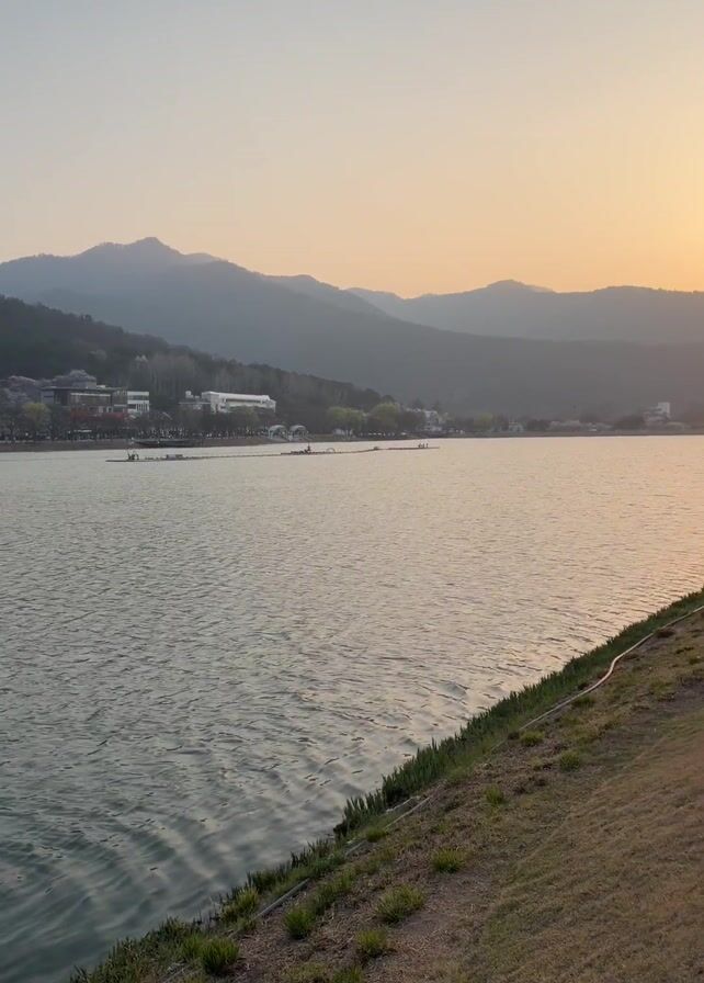 The video pans from left to right, showing a serene sunset over a calm lake nestled amidst mountains. The sky is a soft gradient of orange and yellow as the sun dips behind the mountain range. A few buildings and trees dot the shoreline in the distance. In the foreground, a grassy embankment leads to a concrete walkway with a blue railing. People can be seen walking along the walkway, enjoying the sunset. Small boats are visible on the lake's surface.