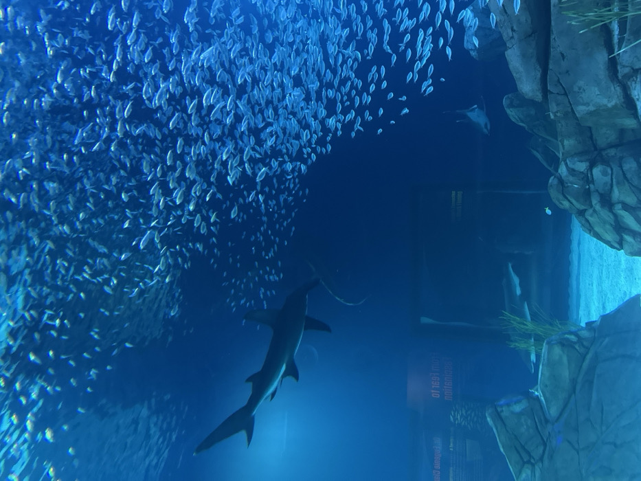An underwater scene presents a large school of small fish congregating near a rocky formation. A shark swims vertically, its silhouette contrasting against the deep blue. A ray is partially visible in the distance, adding depth. Artificial rocks with plant life add to the aquarium-like setting. Text on a glass panel is visible in reverse.