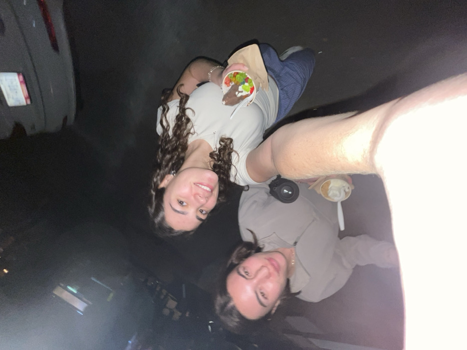Two young women pose for a selfie at night. The woman on the left holds a cup filled with a brown substance and brightly colored toppings. She wears a white t-shirt and has long, curly dark hair. The second woman, in a light brown jacket, holds a cup with a white substance. A black camera is visible near her. A car's taillight is partially visible in the upper left corner. The photo's orientation makes the background difficult to discern.