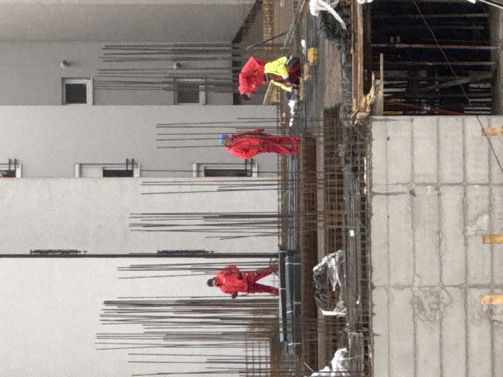 This image depicts an active construction site in Kragujevac, Serbia, showing the upper level of a reinforced concrete structure. Four male construction workers are present on a concrete slab, which is densely arrayed with vertical steel reinforcing bars (rebar) extending upwards, along with visible horizontal rebar grids. From left to right: 1. A worker stands upright, wearing a red full-body suit or jacket and pants, and a dark cap. He is positioned amidst the vertical rebar. To his left, stacks of dark, bundled materials wrapped in plastic are present on the slab. 2. A second worker stands, facing left, wearing a red full-body suit or jacket and pants, and a blue hard hat. 3. A third worker is kneeling or crouching on the concrete surface, wearing a yellow high-visibility jacket over red clothing and a dark cap. This individual appears to be manipulating objects or materials on the ground. 4. The fourth worker stands bent over, facing towards the kneeling worker, dressed in a red jacket and pants. This worker appears to be observing or interacting with the kneeling individual. Below the main construction platform, a lower concrete structure is visible, along with white plastic-wrapped bundles of materials. On the far right, exposed wooden formwork and vertical supports are discernible. In the background, a light-colored, multi-story building, likely residential, is visible. It features multiple windows, some with external blinds or shutters. The sky is overcast.