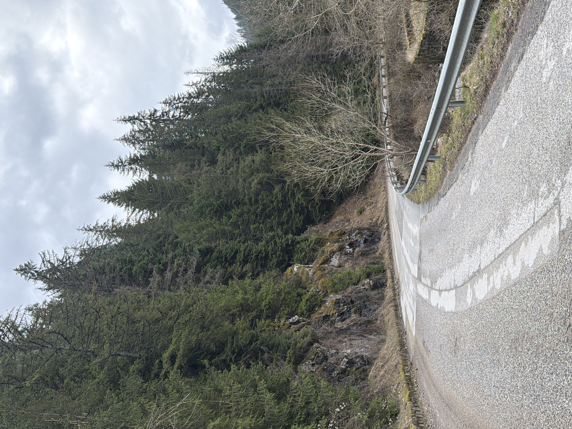 The image depicts a winding road in a forested area, likely a mountainous region. The road is asphalt, with faded white markings along the edges. A metal guardrail runs along the side of the road. On the left, a steep slope is covered with a dense forest of evergreen trees and bare trees, and some rocky outcrops. The sky is overcast. The location is potentially near Shiroka Laka, Bulgaria, given the landscape's characteristics. There are no people or moving objects visible in the image.