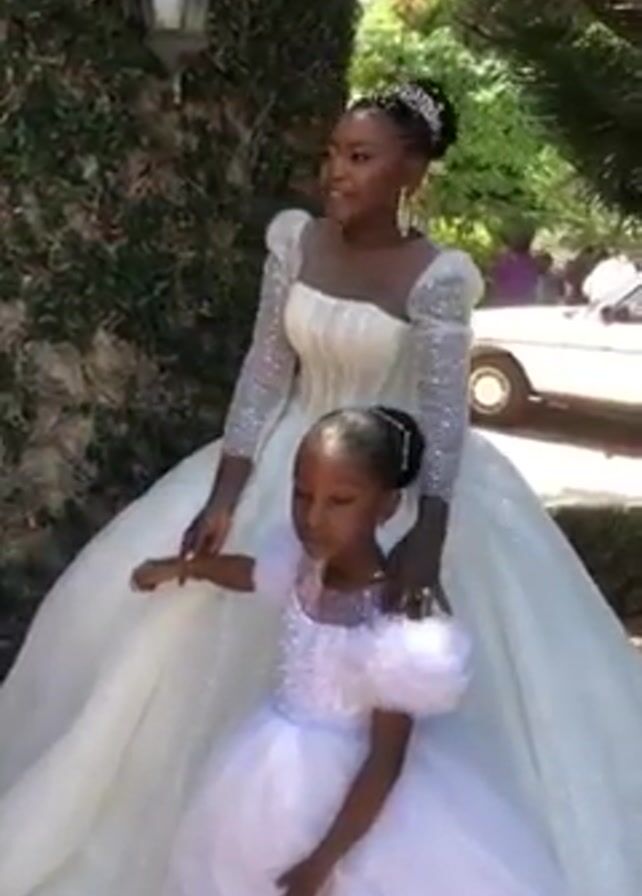 A woman and a young girl stand together outside on a sunny day. They are both dressed in white dresses, with the woman's dress being an elaborate wedding gown and the girl's dress resembling a miniature version of a wedding dress. The woman wears a jeweled headpiece and has her hair in an updo. The girl's hair is also styled. They are positioned in front of a wall covered with greenery. A vintage car is partially visible in the background. The woman has her hands on the girl's arms, seemingly posing for a photo. The woman smiles, while the girl alternates between looking directly at the camera and to the side.