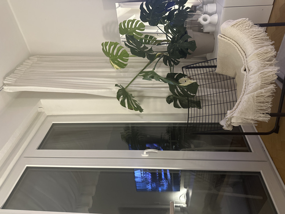 A bright room features a large window with sheer white curtains. A Monstera plant sits in a black wire basket near the window, adding a touch of greenery. A white throw blanket with fringe is draped over a chair next to the plant. The window reflects a blue light, possibly from a television. A white cabinet and various decorative items are partially visible in the background.