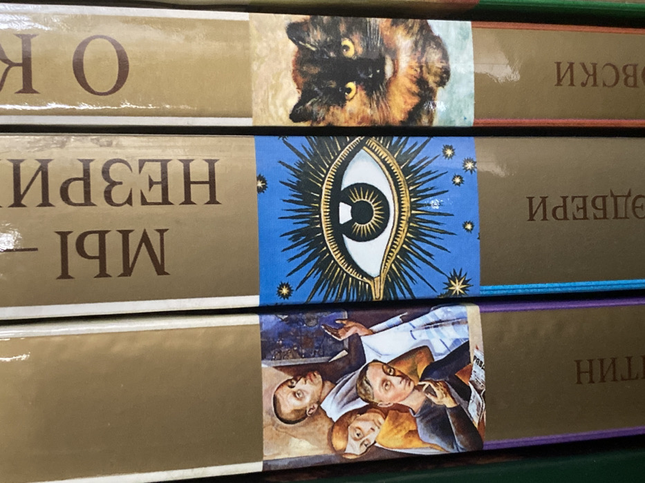 Three books are observed vertically aligned on a shelf, presenting their spines. The upper portion of each visible spine is a uniform gold/beige color. The leftmost full book spine features a multi-figure illustration on its lower half. The illustration depicts four stylized human figures. Prominently, a pale-skinned man with a bald head and gaunt features looks upward and right. Below him, a woman with brown hair and a yellow garment looks forward. In the foreground, a young man with short dark hair, also pale, holds what appears to be a lit pipe or cigarette in his right hand, looking towards the viewer. A piece of paper with visible text rests below his hands. The bottom edge of this book spine is purple. Partial vertical text "ТИН" is visible on the gold section below the illustration. The central book spine, labeled "МЫ НЕЗРИМЫЕ" (WE ARE THE INVISIBLE ONES) in vertical gold text on its upper gold section, displays a vibrant blue lower half. This blue section is adorned with a large, stylized white "All-Seeing Eye" or "Eye of Providence" emblem, featuring a dark pupil and iris, surrounded by radiating golden lines. Numerous small, four-pointed golden stars are scattered across the blue background. The bottom edge of this spine is light blue. Vertical text "ЭДБЕРИ" is visible on the gold section below the illustration. The rightmost full book spine, labeled "О К" in vertical gold text on its upper gold section, features a detailed portrait of a tortoiseshell cat on its lower half. The cat has patches of black, orange, and brown fur, with bright yellow/amber eyes, and faces directly forward. The bottom edge of this spine is reddish-brown. Vertical text "ОВСКИ" is visible on the gold section below the illustration. Portions of additional book spines are visible on the far left (dark green edge) and far right (brownish edge), suggesting a row of books. The lighting is uniform, suggesting an indoor setting. The image provides no discernible visual information, such as landmarks, street signs, or unique architectural features, to determine a specific location within the city of Perm, Russia.