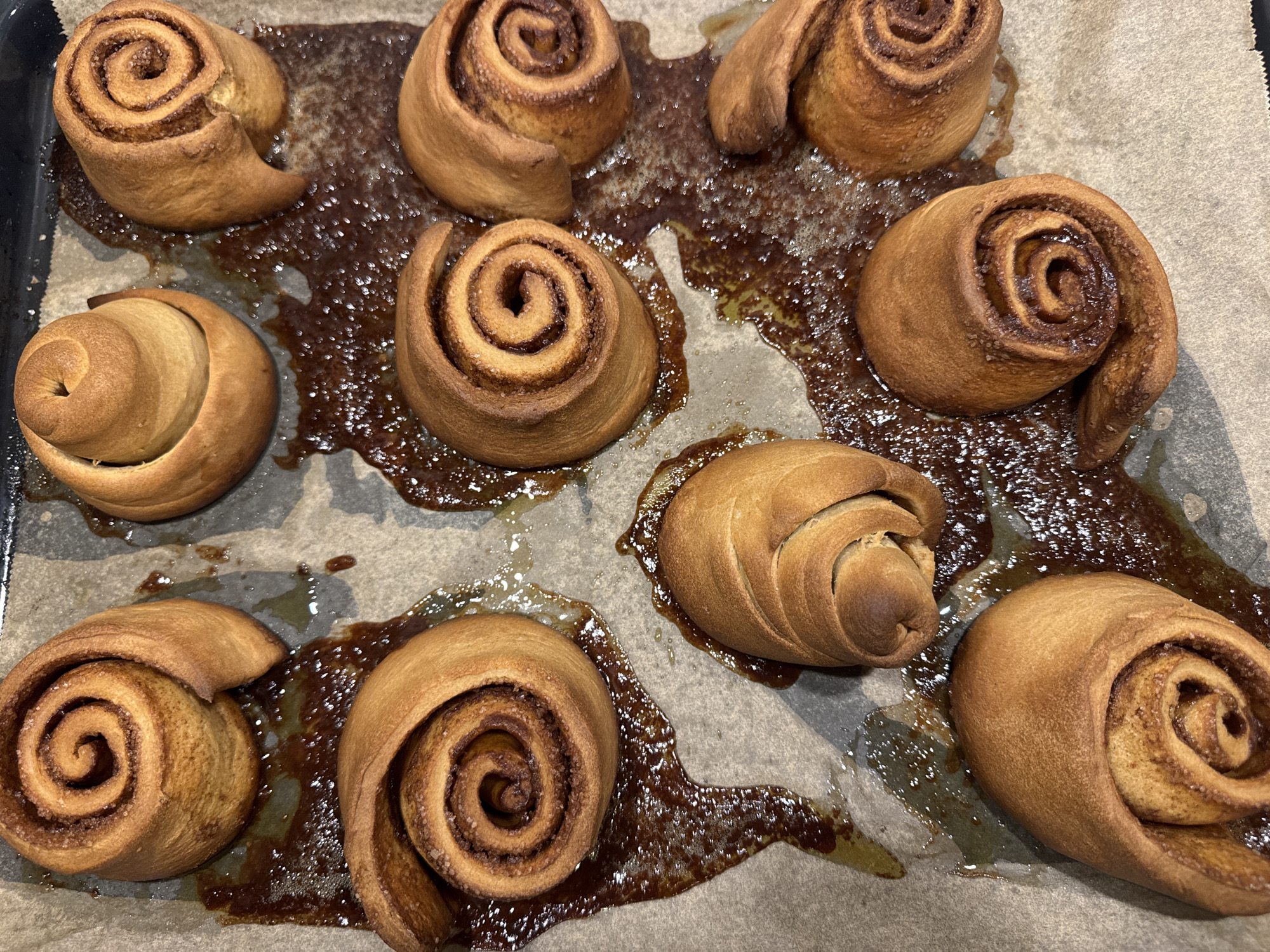 The image depicts a baking sheet lined with parchment paper on which ten cinnamon rolls are baked. The rolls are golden brown and surrounded by a caramel-like liquid, likely melted butter and sugar from the filling that has leaked out during baking. The scene is indoors, likely a kitchen. The location is not discernible from the image, so it is not possible to confirm if it is in Tvarditsa, Bulgaria. No people are visible.